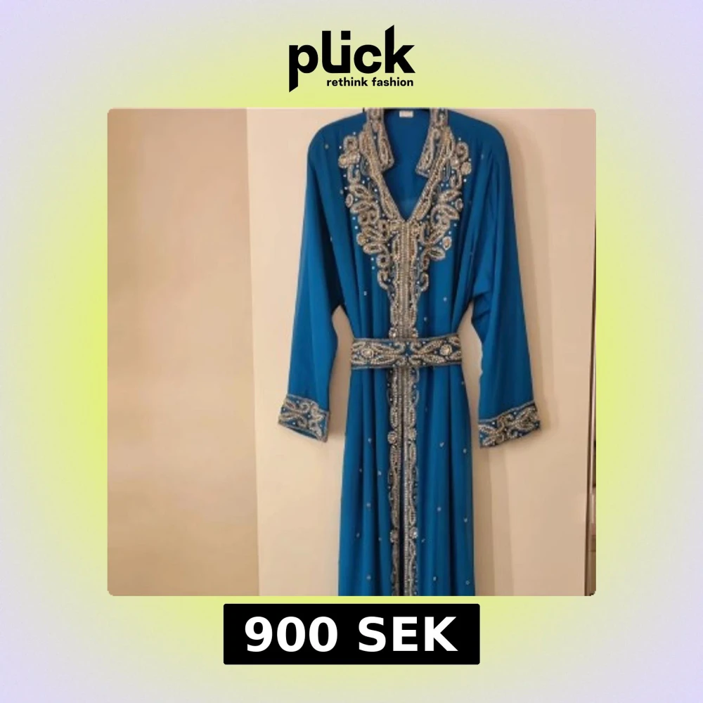 Säljer en blå långklänning med fantastiska silverbroderier och pärldetaljer längs krage, ärmslut och hela framsidan. Klänningen har v-ringning, lång ärm och ett matchande bälte i midjan. Perfekt för dig som vill sticka ut med en elegant och unik look.