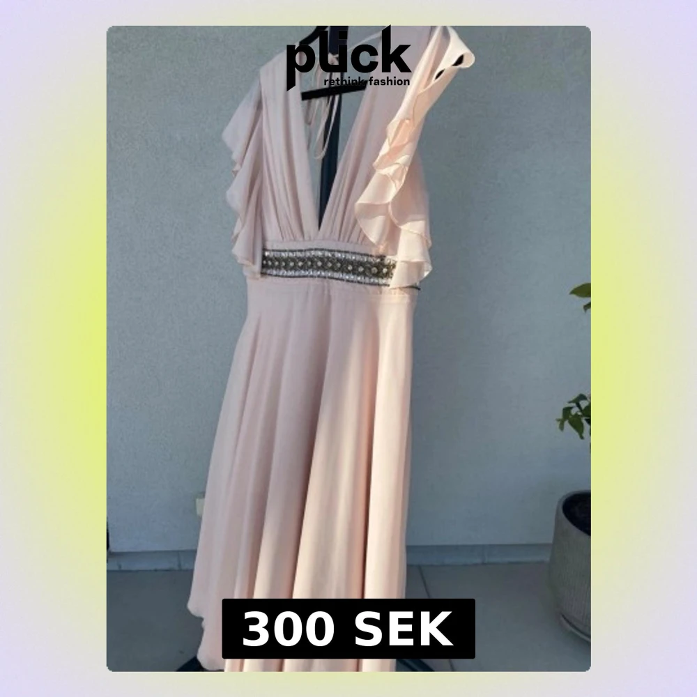 Elegant ljusrosa tre kvarts längd med djup v-ringning och volangdetaljer längs axlarna. Klänningen har ett brett midjeband dekorerat med pärlor och paljetter samt öppen rygg med knytband. Perfekt för speciella tillfällen. Uk size 12
