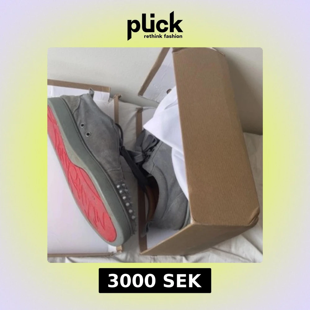 Säljer ett par gråa sneakers i mocka med coola nitar framtill och klassisk röd sula. Skorna har snörning och rund tå, vilket ger en unik och edgy look. Perfekta för dig som vill sticka ut med din stil.