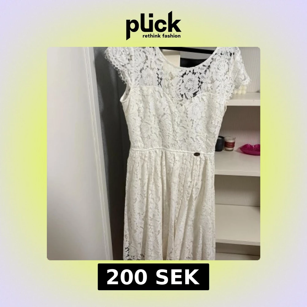 Superfin vit klänning i spets med blommigt mönster och öppen rygg. Klänningen har korta ärmar och markerad midja, vilket ger en romantisk och somrig känsla. Perfekt för dig som gillar detaljer och vill sticka ut med en elegant look.