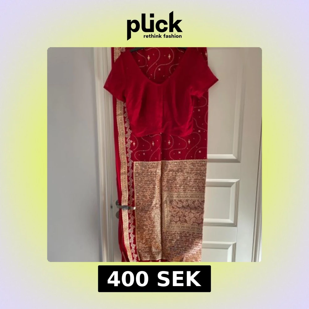 Elegant röd sari med gulddetaljer och mönster. Från Sti Lanka. Aldrig använd