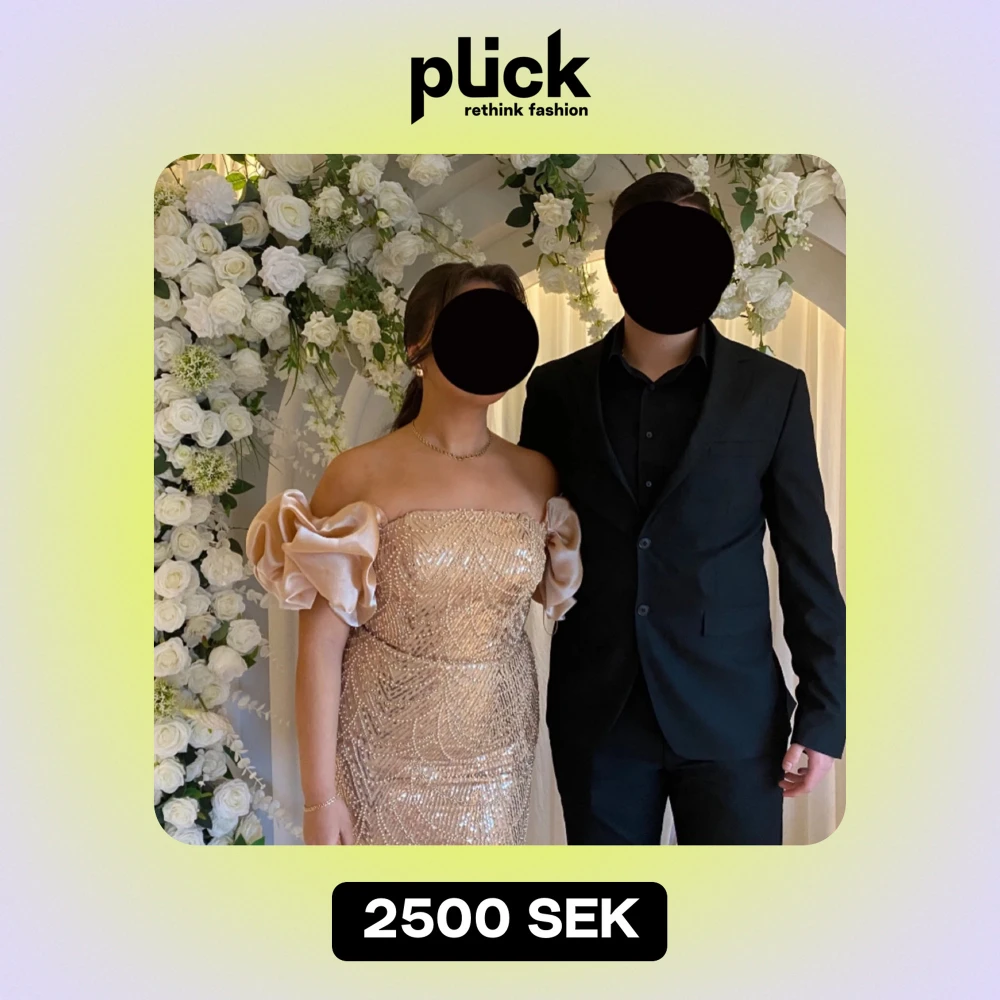 Elegant glittrig klänning i guld med puffiga ärmar ,Klänningen har en åtsittande passform och är perfekt för festliga tillfällen. Endast använd ett par timmar,priset går att diskutera?