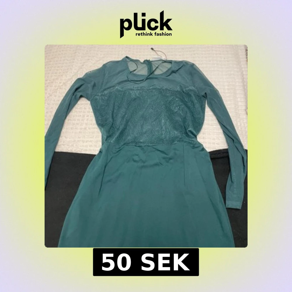 Elegant grön klänning med långärmad design och spetsdetaljer på överdelen. Klänningen har en dragkedja i ryggen och en rund halsringning med en liten öppning. Perfekt för en stilfull look.