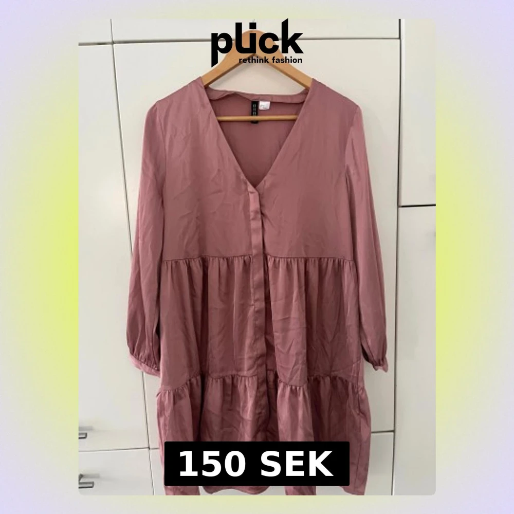 Superfin rosa klänning från H&M Divided i storlek 42. Klänningen har v-ringning, långa ärmar med resår vid handlederna och flera volanger som ger en luftig och avslappnad look. Perfekt för dig som gillar en feminin och trendig stil.