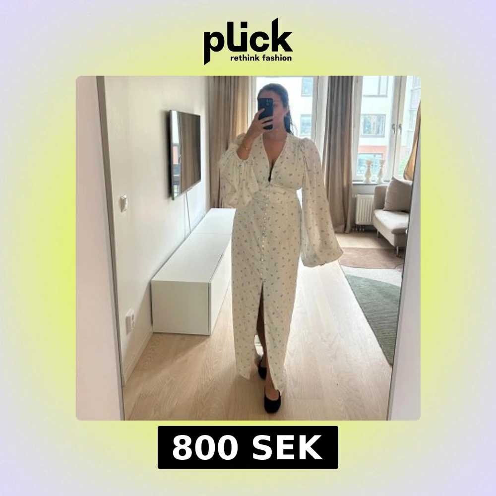 Superfin vit Adoore långklänning med små blå blommor, puffiga långärmar och v-ringad hals. Aldrig använd, prislappar sitter kvar. Nypris 1695kr, Storlek 42 (liten i storleken)