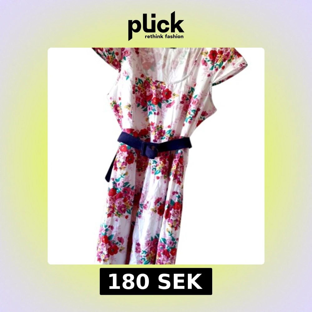 Sval och vacker sommarklänning i rött, vitt och rosa med härligt blommigt mönster. Tillverkad i 100% bomull – perfekt för varma dagar! Obs! Skärpet hör inte till. Klänningen har en rund halsringning, korta ärmar och hällor för skärp om du vill markera midjan. Kjolen är vid och fodrad vilket ger ett fint fall. Mått (liggande, ca): • Bystvidd: 56 cm • Midja: 46 cm • Längd: 88 cm En riktig sommarfavorit – bekväm, luftig och fin!