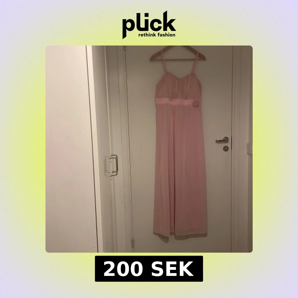Romantisk ljusrosa långklänning med smala justerbara axelband och en söt blomdetalj i midjan. Silikonkat runt om för att kunna använda klänningen utan axelband. Klänningen har ett mjukt och lätt, fallande tyg och markerad midja med band. Perfekt för dig som vill ha en feminin och elegant look. Ganska stor i storleken och vid bysten. Använd en gång.