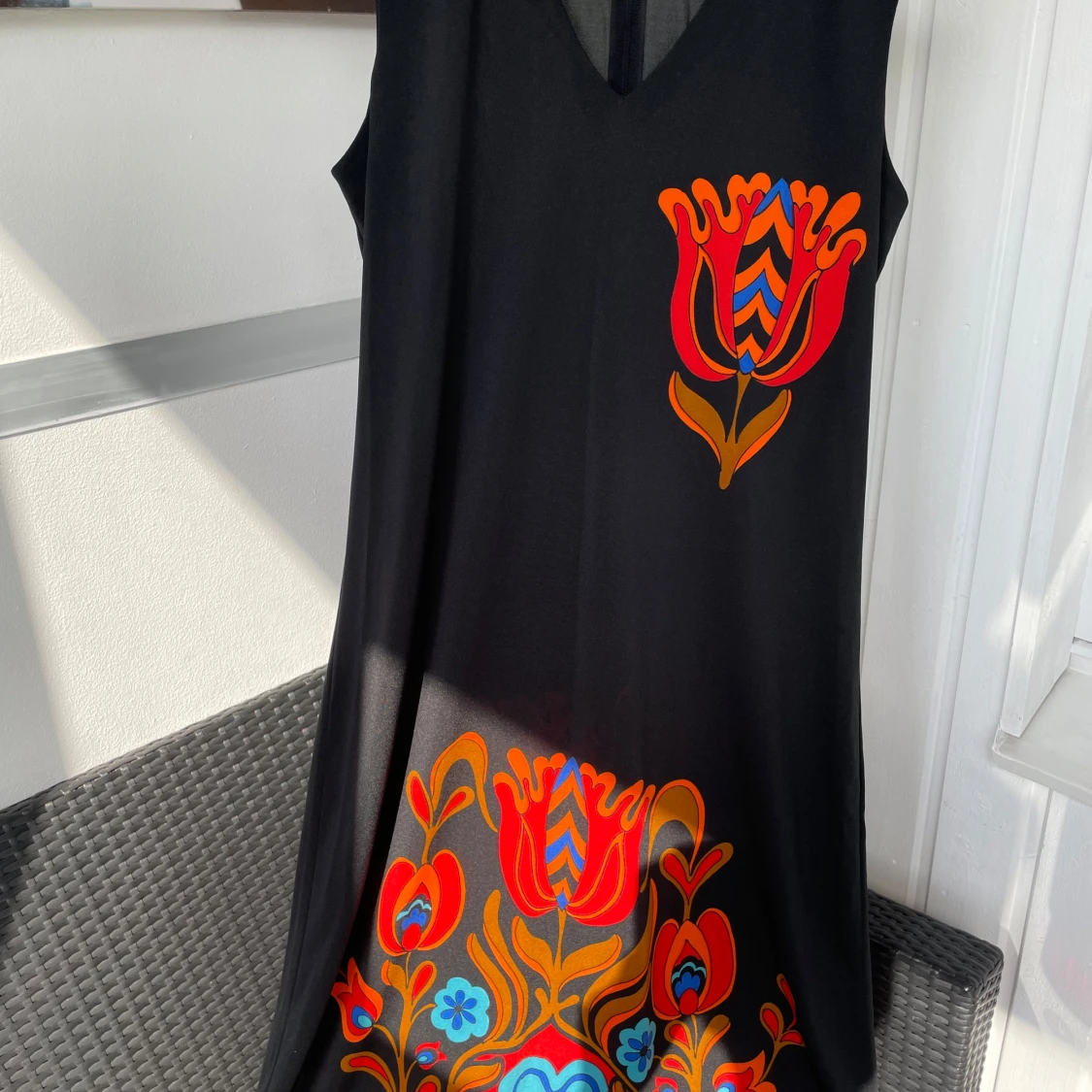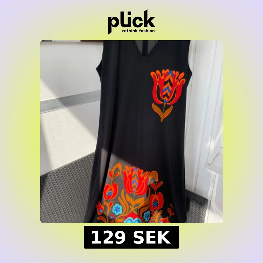 Svart ärmlös kortklänning från Holly & Whyte by Lindex med färgglada blommiga tryck i rött, orange och blått. Klänningen har v-ringning och ett snyggt blommönster både fram och bak. Perfekt för dig som gillar retrovibbar och färg.