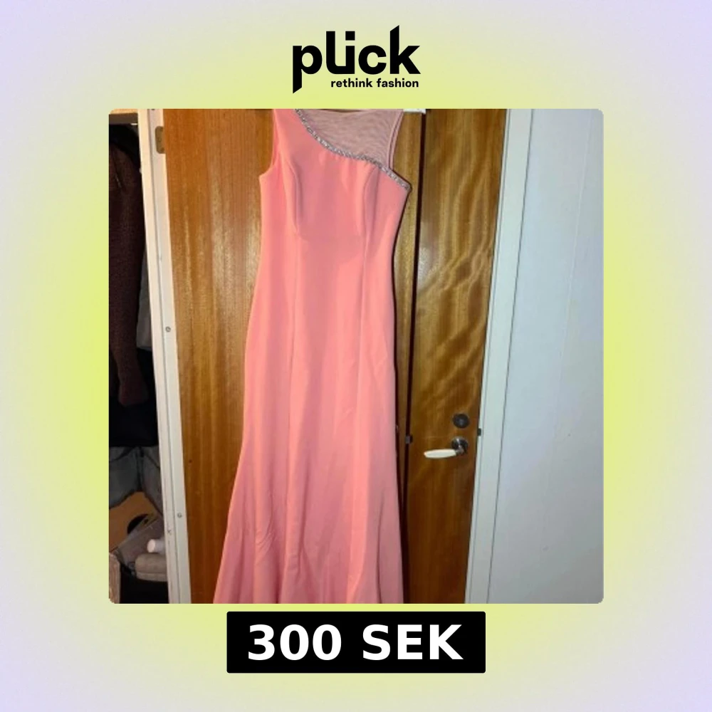 Säljer en elegant långklänning i rosa med oneshoulder-design och transparent mesh upptill. Klänningen har glittriga strassdetaljer längs kanten och är perfekt för bal eller fest. Materialet är slätt och följsamt.
