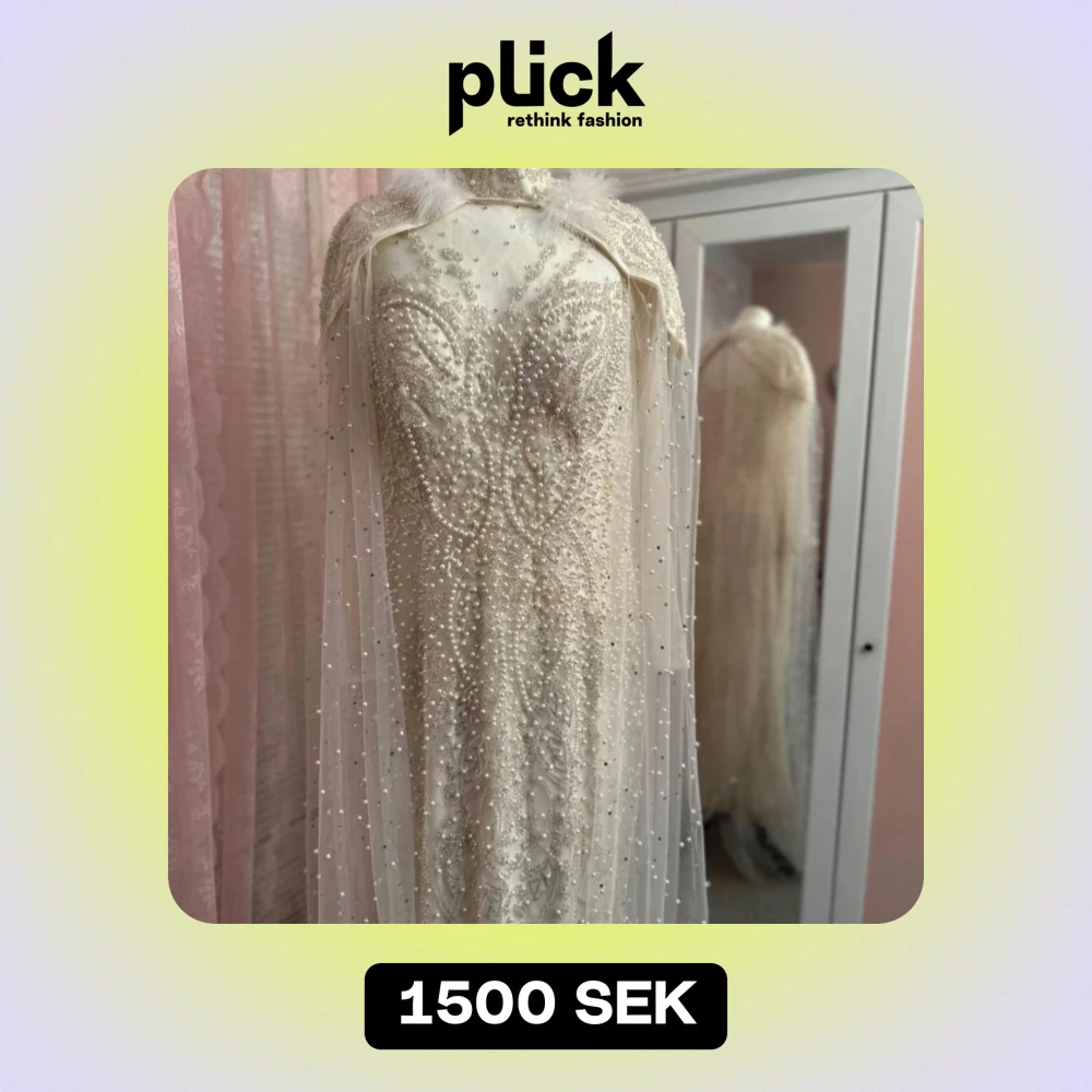 Säljer en fantastisk vit klänning med glittrande detaljer och pärlor. Den har en elegant cape med fjäderdetaljer vid axlarna. Perfekt för en glamorös fest eller nyårsafton. Klänningen är lång och har en tight passform som framhäver figuren.