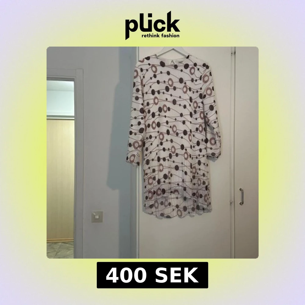 Säljer en vit klänning med brunt och rosa prickigt och randigt mönster. Klänningen har lång ärm och är något längre i modellen. Perfekt för dig som gillar unika mönster och en avslappnad stil.