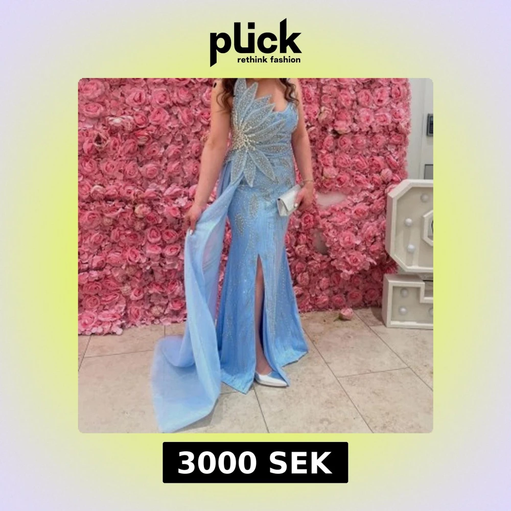 Säljer en ljusblå långklänning med glittriga detaljer och pärlor framtill. Klänningen har smala axelband, en v-ringad omlott-topp och en elegant slits framtill. Materialet är glittrigt och lätt, med ett långt släp som ger extra wow-effekt. Använd endast en gång! Priset kan diskuteras. Nypris 6000!