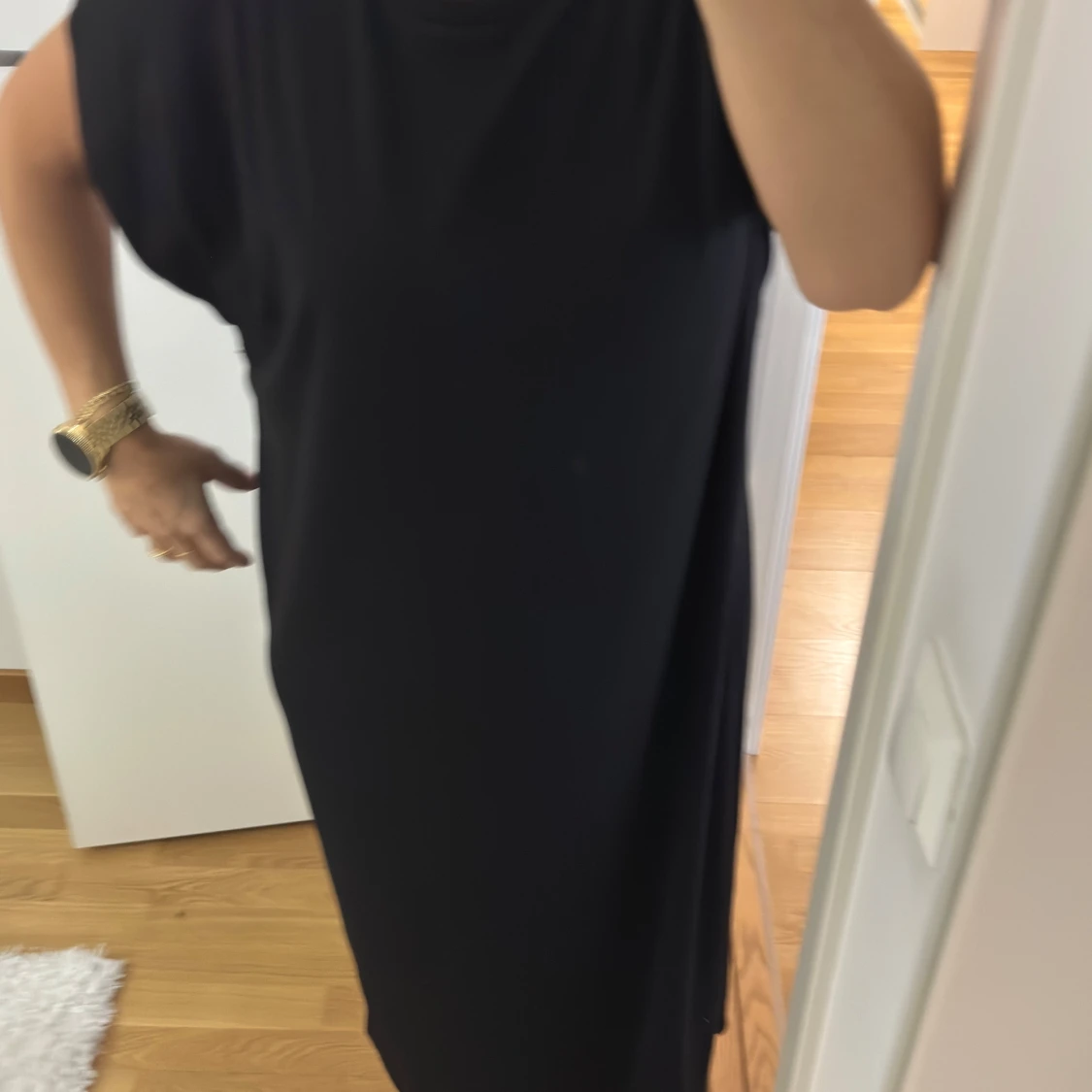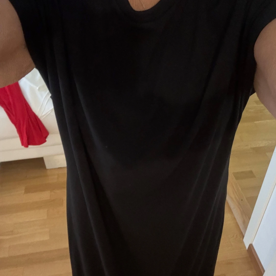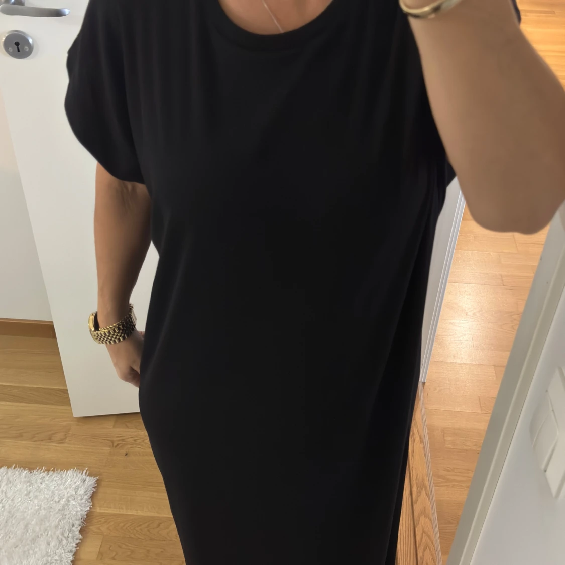 En svart långklänning med rund halsringning och korta ärmar. Klänningen har en rak och loose passform, vilket gör den bekväm och enkel att styla. Tillverkad i mjuk bomull, perfekt för en avslappnad look.