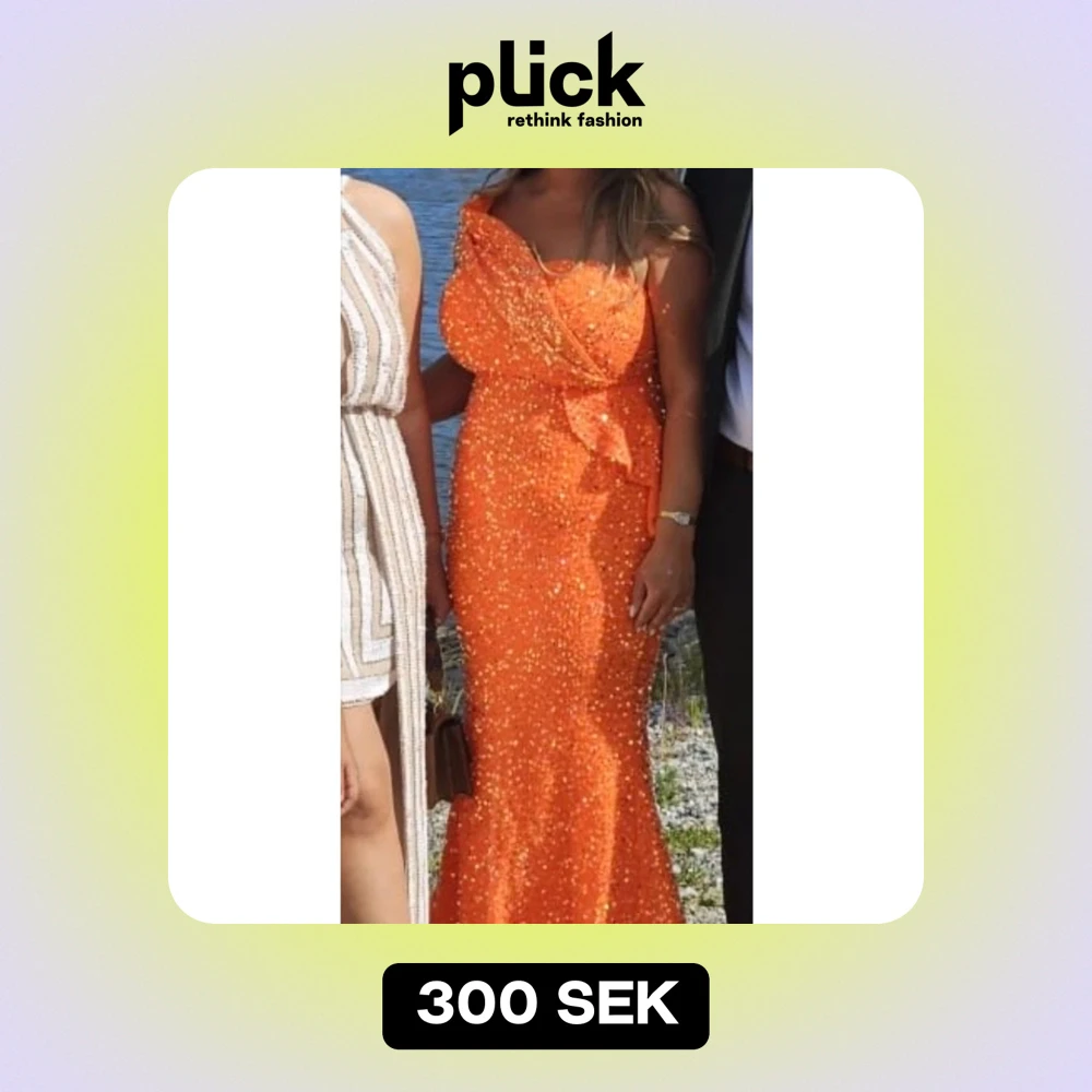 Säljer en fantastisk orange långklänning med glittrande paljetter. Klänningen har en elegant offshoulder-design och en vacker volangdetalj framtill. Perfekt för festliga tillfällen där du vill sticka ut och glänsa. Passar perfekt för sommarens alla fester! 🌟