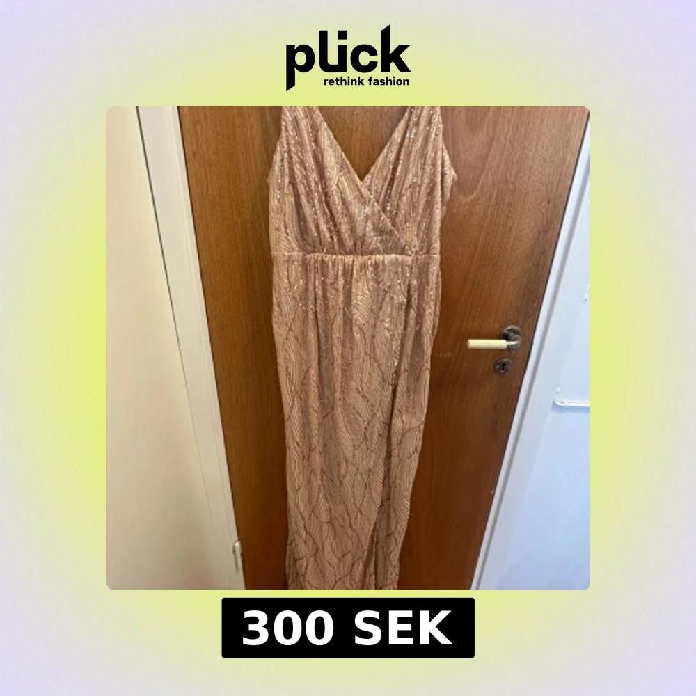Säljer en lång, champagnefärgad paljettklänning från Henriette med v-ringning och omlottliv. Klänningen har en snygg slits framtill och glittrigt mönster som ger en lyxig känsla. Perfekt för dig som vill sticka ut och glänsa på festen!