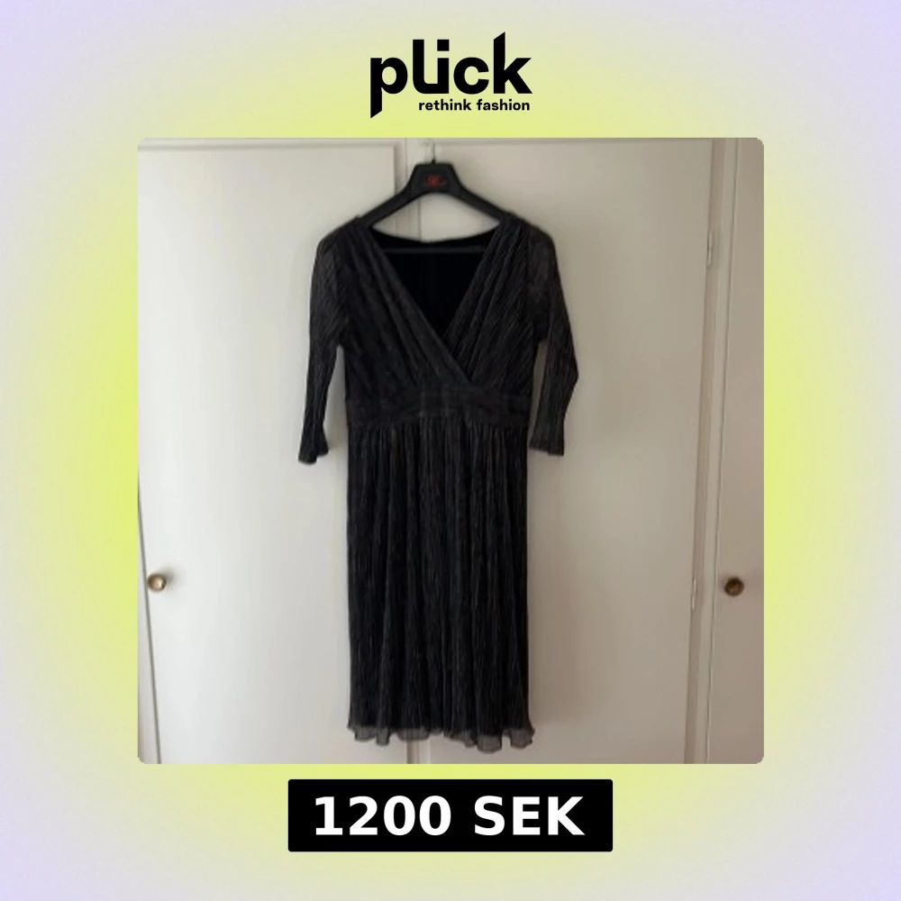Säljer en svart klänning från SWING med glittriga inslag och v-ringad omlottfront. Klänningen har trekvartsärm och ett plisserat kjolparti som ger ett elegant fall. Perfekt för dig som vill sticka ut med stil.