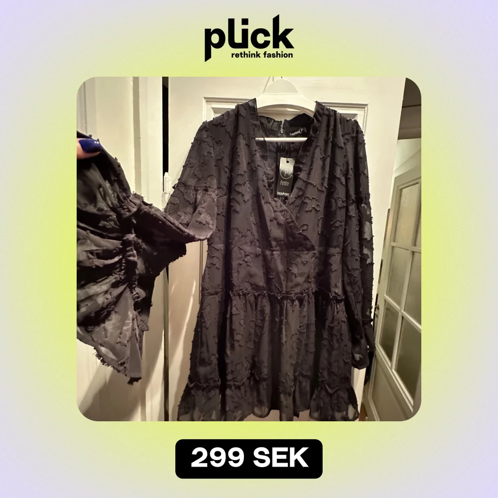Snygg svart klänning från Boohoo i nytt skick (prislapp). Den har ett vackert mönster och volangdetaljer som ger en romantisk touch.