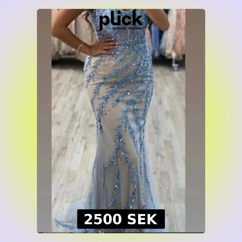 Elegant långklänning i champagnefärgad mesh med blå paljettbroderier och offshoulder-design. Klänningen har figurnära passform och transparenta detaljer upptill, vilket ger en lyxig och modern look. Perfekt för dig som vill sticka ut på bal eller fest. Endast använd 1 gång och har sytt in en extra tyg bit för bak som man kan sy bort vid behov. Storlek: 40-46