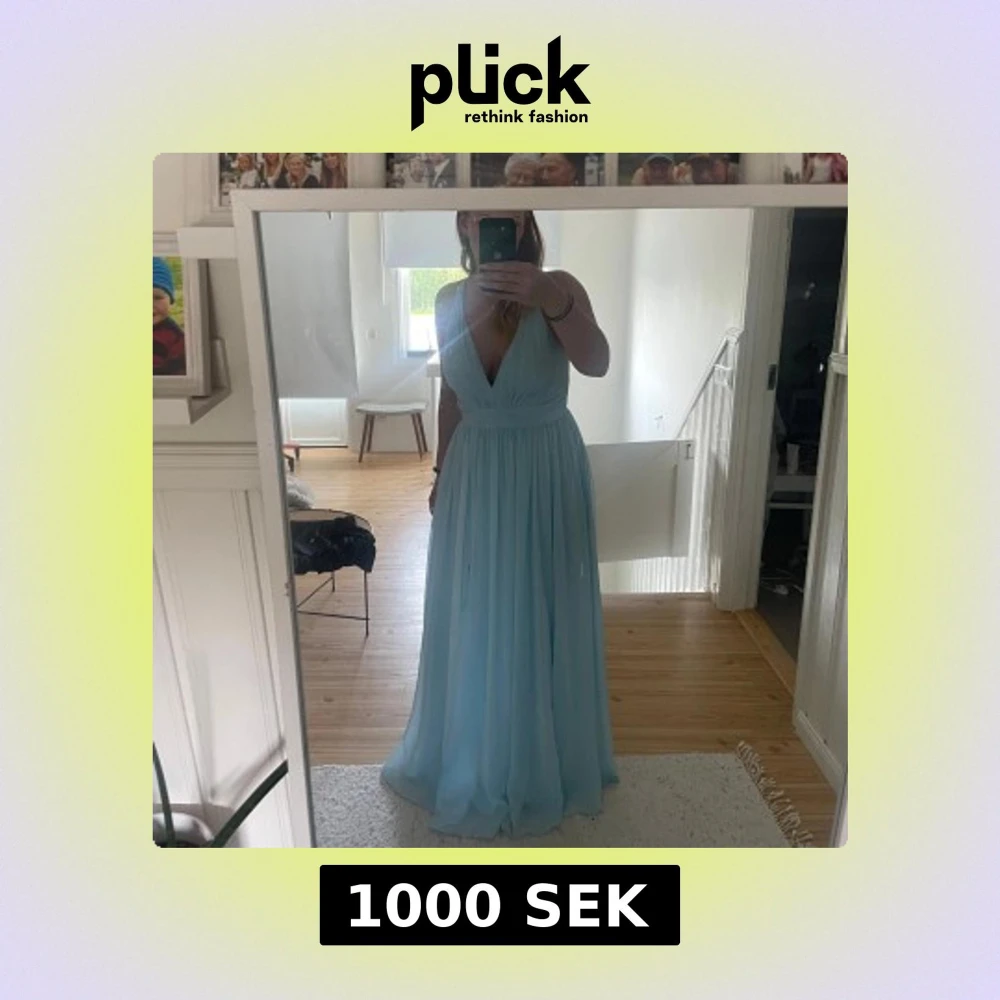 Säljer en superfin ljusblå balklänning från JJ’s House med djup v-ringning, slits och smala axelband som korsas i ryggen. Klänningen har ett flowigt fall och markerad midja. Använd 1 gång, st 42 men är något minde i storleken, så den är som en st 40