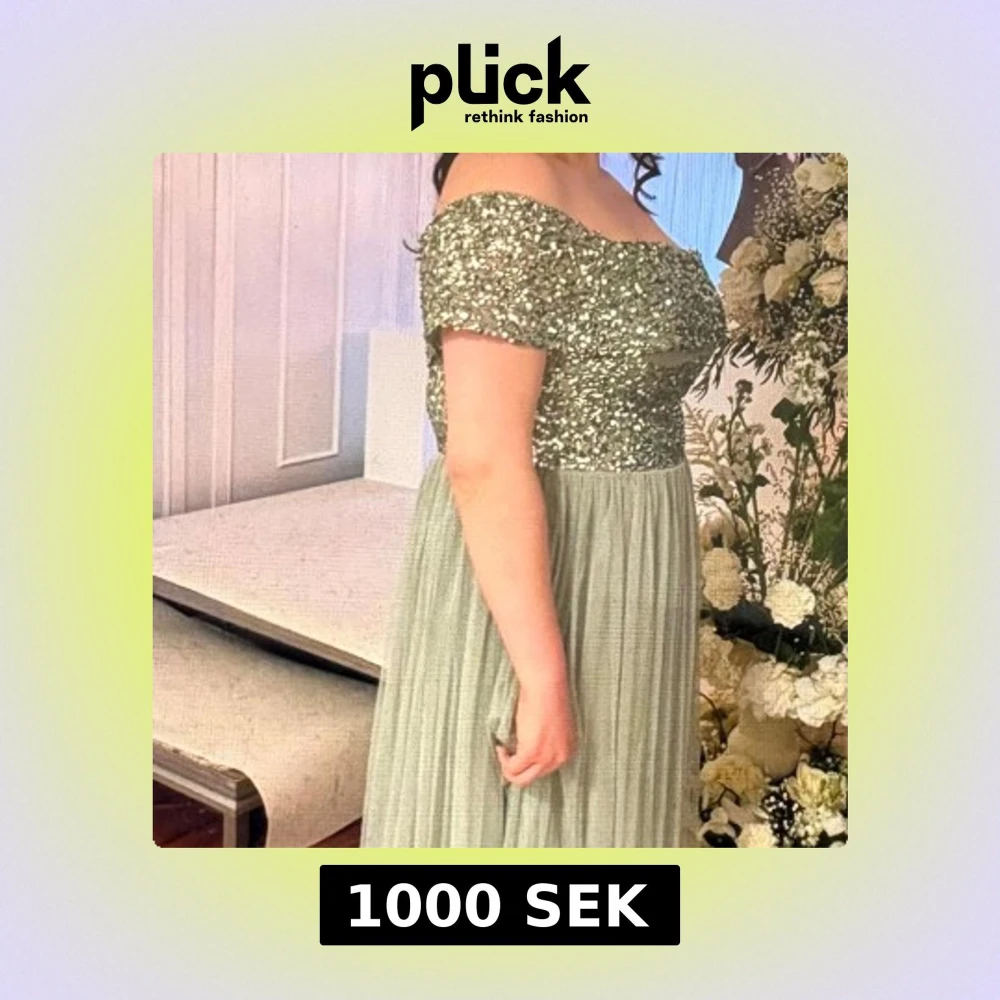Säljer en elegant grön långklänning med glittrig överdel och offshoulder-modell. Klänningen har en flowy kjol i tunt tyg och en vacker paljettprydd överdel som ger extra festkänsla. Perfekt för bal eller festliga tillfällen.