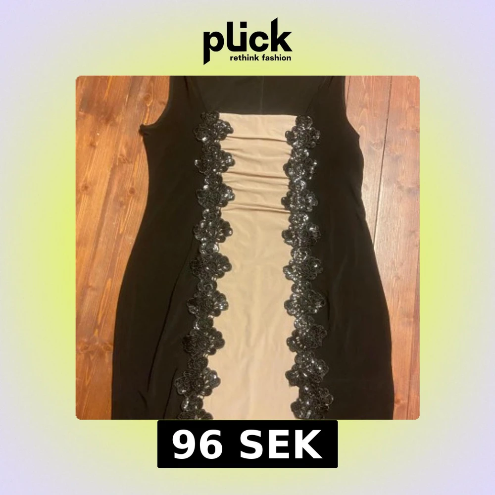 Supersnygg svart och beige klänning från Bodyflirt med ärmlös design. Klänningen har en beige mittpanel med svarta blommiga spetsdetaljer och paljetter längs sidorna. Figurnära passform som ger en elegant siluett. Perfekt för dig som vill sticka ut.