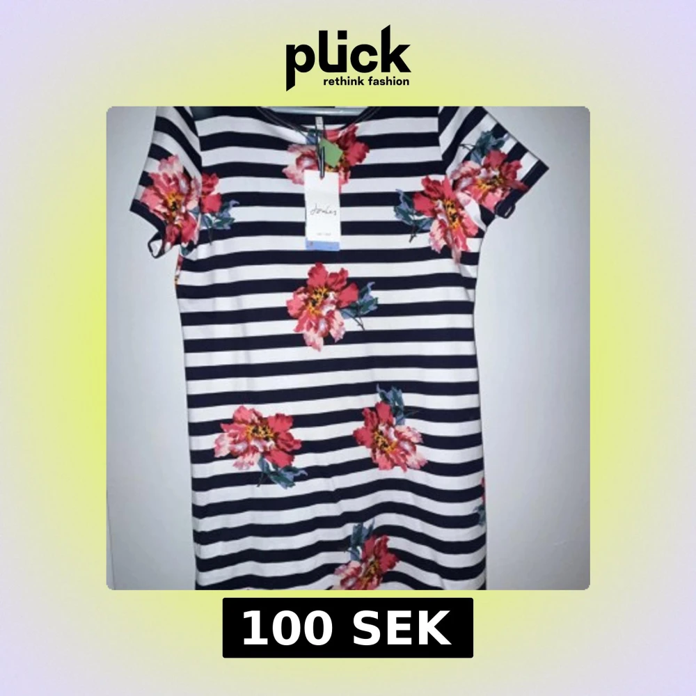 Säljer en snygg randig klänning från Joules med blommigt mönster i rosa och rött. Klänningen har korta ärmar och en bekväm passform. Perfekt för en somrig look! Nypris 55 euro vilket motsvarar cirka 635kr. Aldrig använd med etikett!