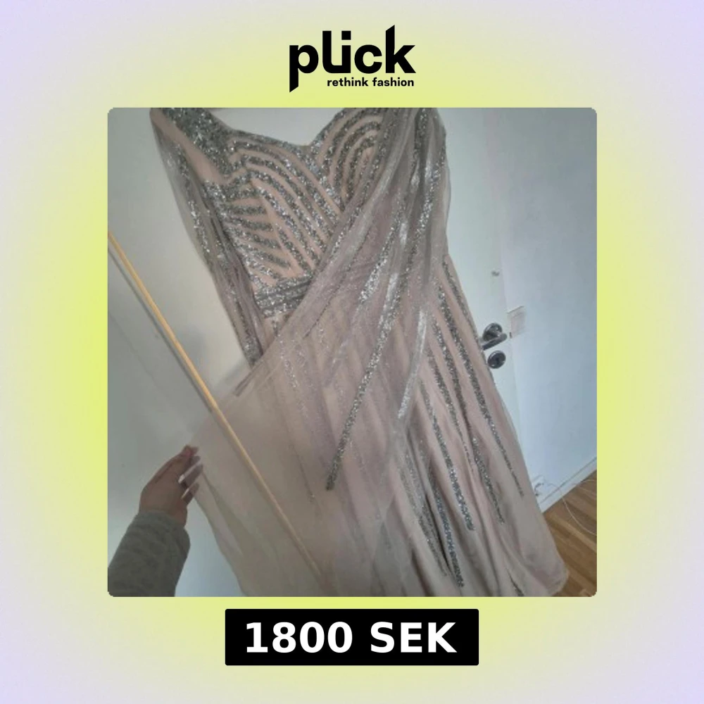 Elegant långklänning i ljus beige med glittriga silverdetaljer. Klänningen har en v-ringad design och långa ärmar med ett transparent utseende. Perfekt för festliga tillfällen med sin glamorösa stil.