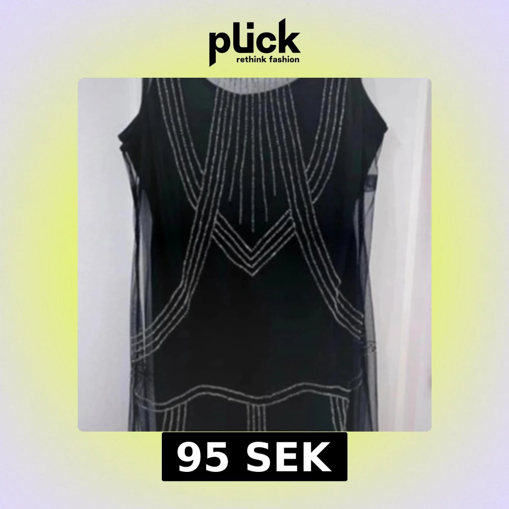 Snygg svart ärmlös klänning från Bodyflirt med silverfärgade detaljer i ett geometriskt mönster. Perfekt för en elegant kvällslook. Klänningen har en transparent överdel som ger en stilren touch.