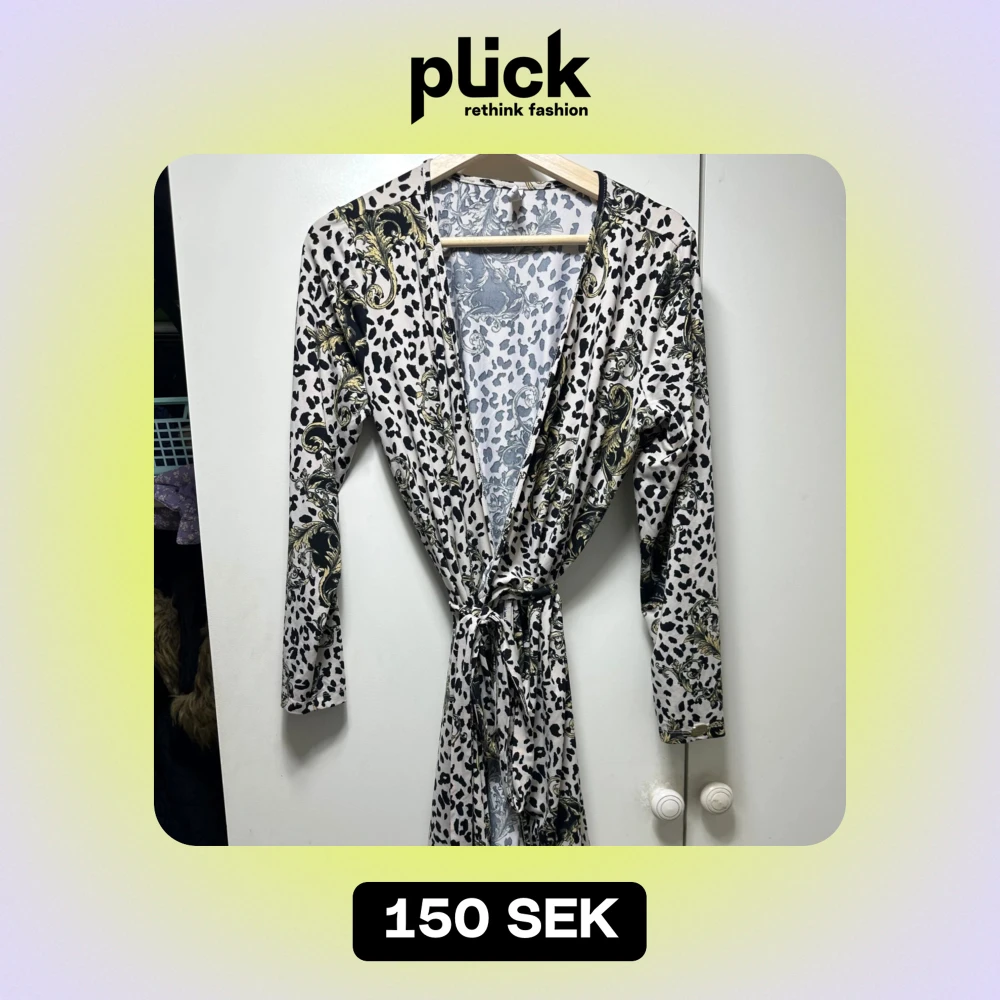 Snygg och unik omlottklänning med leopardmönster och detaljer i guld. Klänningen har långa ärmar och ett knytband i midjan för en perfekt passform. Perfekt för både vardag och fest!