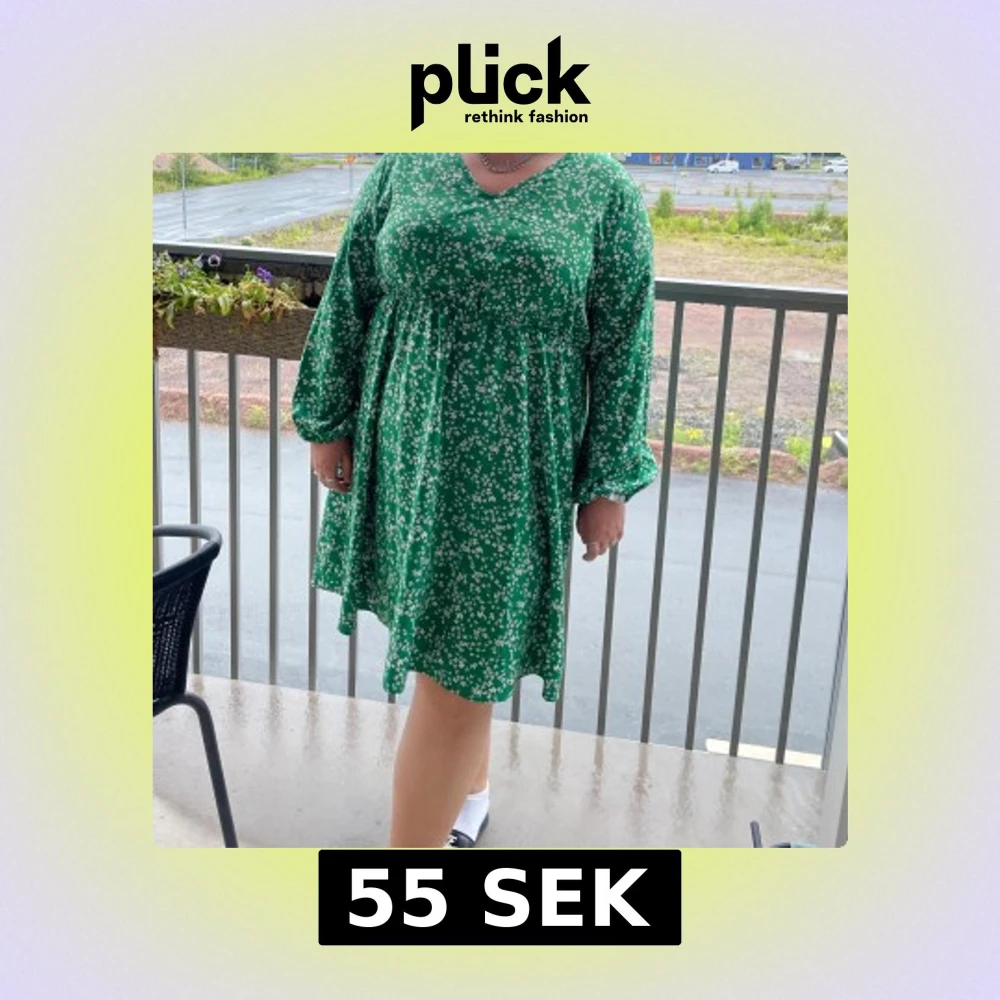 Superfin grön klänning med små vita blommor, v-ringad hals och långa ärmar. Modellen är kort och har en lös passform som ger en skön och avslappnad känsla. Perfekt för vår och sommar när du vill känna dig både söt och bekväm.