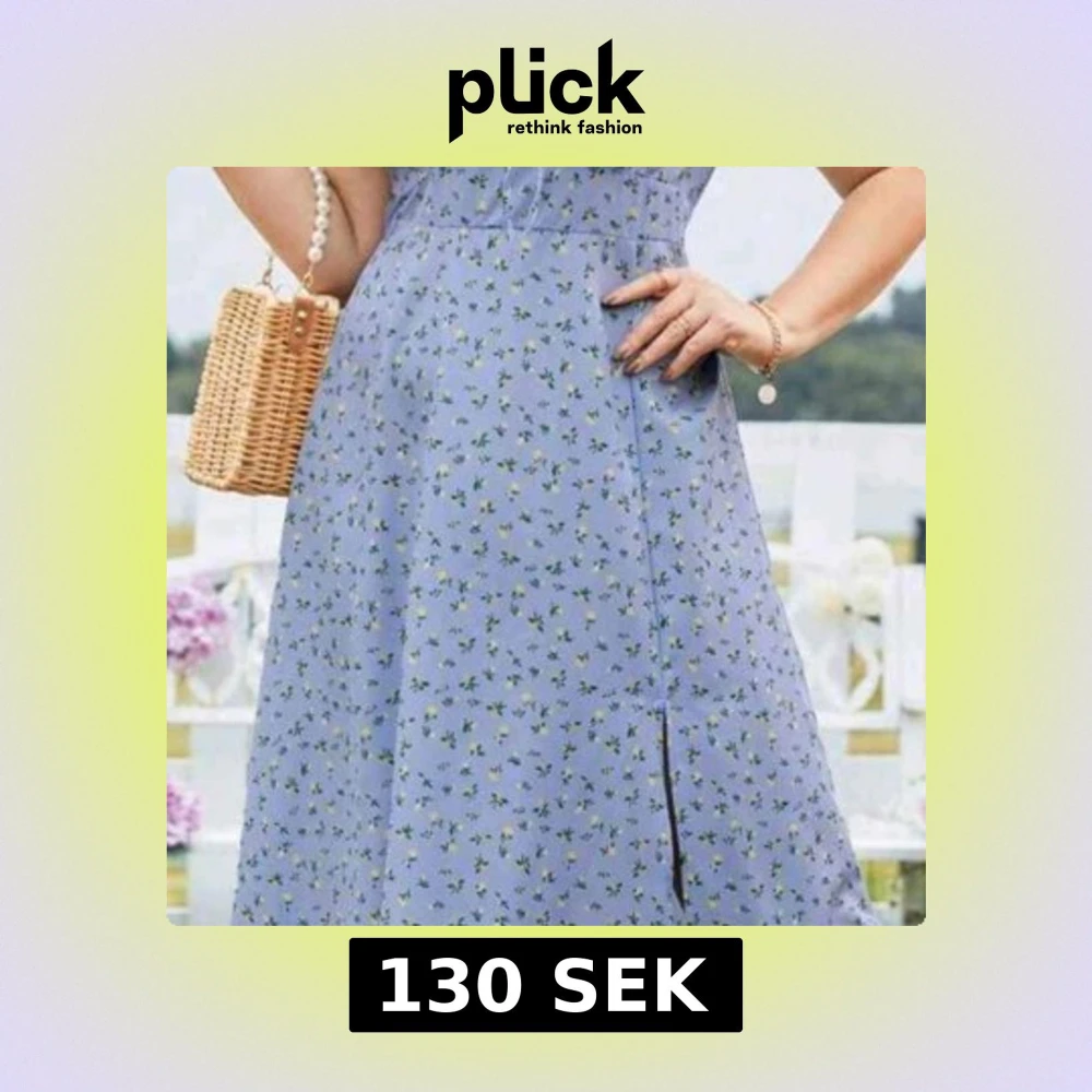 Superfin ljusblå klänning med små gröna blommor och en diskret slits framtill. Klänningen har en feminin passform och är perfekt för varma dagar. Bär den med en korgväska för en somrig look! Passar storlek 1XL- 2XL