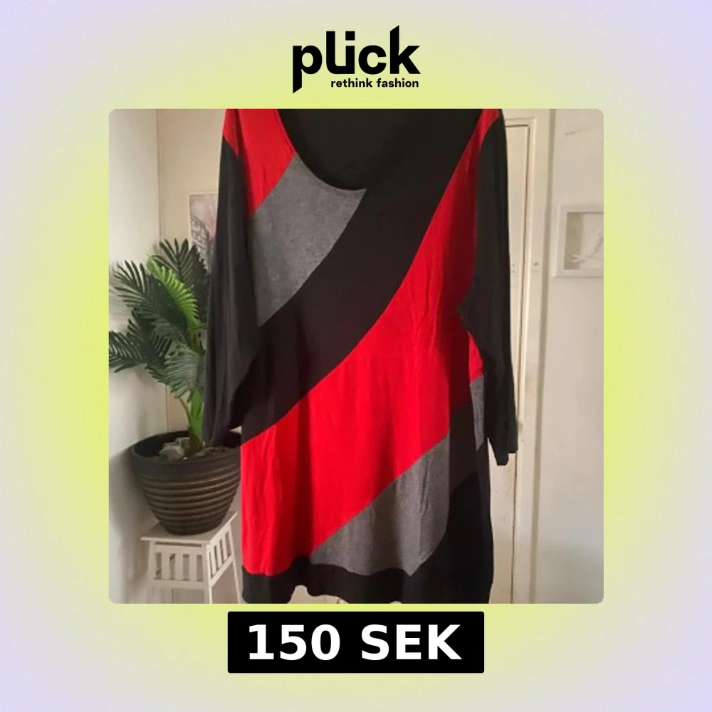 Cool kortklänning /tunika med breda diagonala block i rött, svart och grått. Klänningen har rund halsringning och trekvartsärmar. Mjuk och stretchig känsla, perfekt för dig som gillar färg och grafiska mönster.