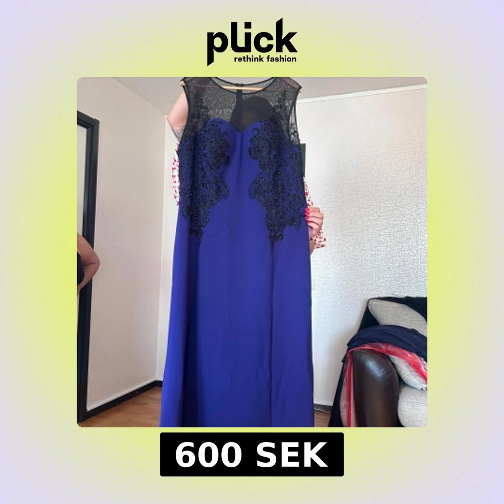 Säljer en elegant långklänning i djupblå färg med svart mesh upptill och vackra svarta spetsapplikationer med pärlor över bröstet. Klänningen har ärmlös design och en rak, svepande siluett som ger en lyxig känsla. Perfekt för bal eller fest