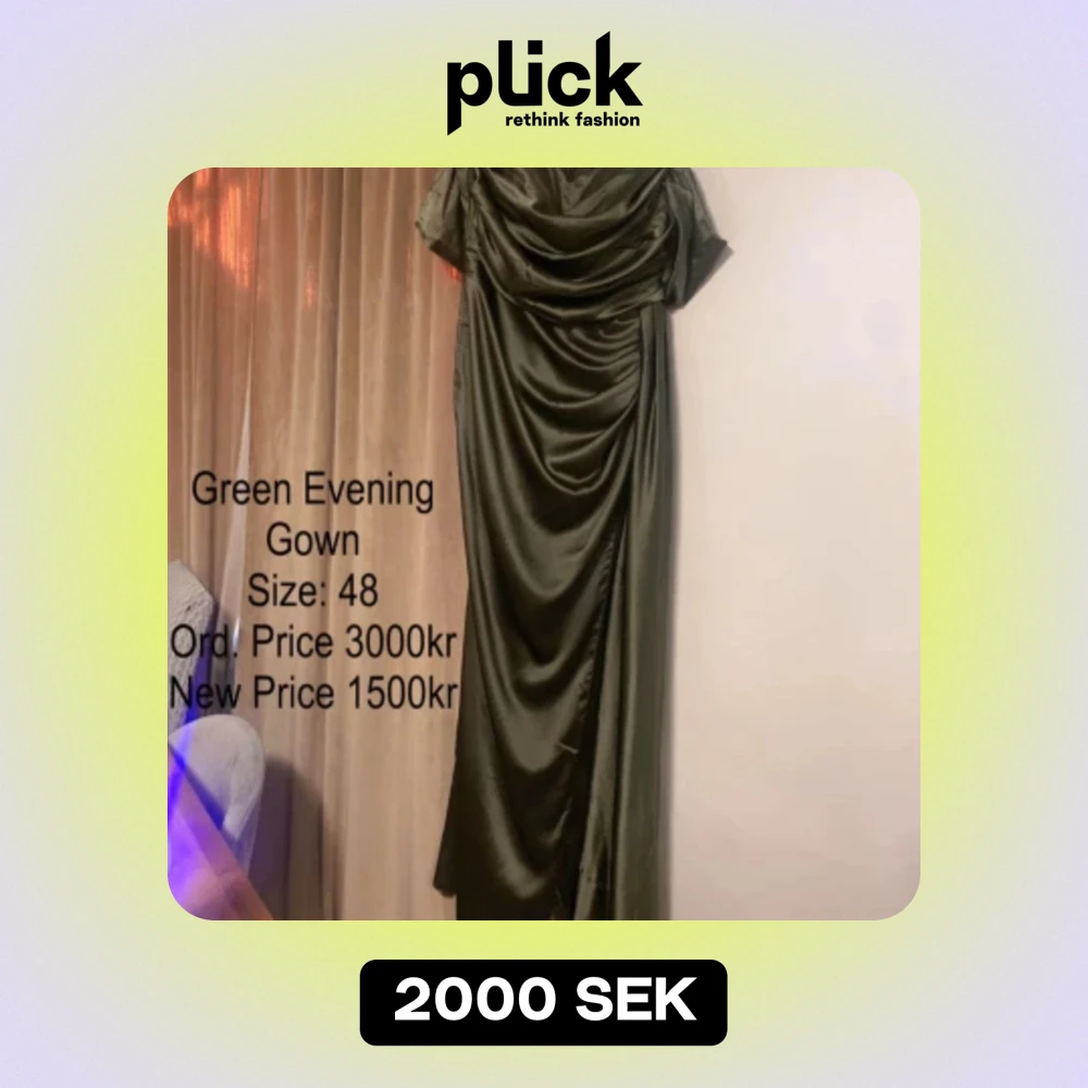 Säljer en elegant grön aftonklänning i storlek 48. Klänningen har en vacker drapering och är tillverkad i ett glansigt material som ger en lyxig känsla. Perfekt för festliga tillfällen!