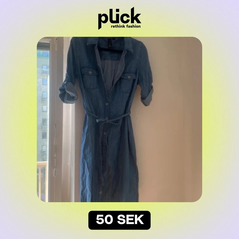 Säljer en snygg jeansklänning i blått med knytband i midjan. Klänningen har långa ärmar som kan rullas upp och knäppas med knappar framtill. Perfekt för en avslappnad dag eller en sommarfest!