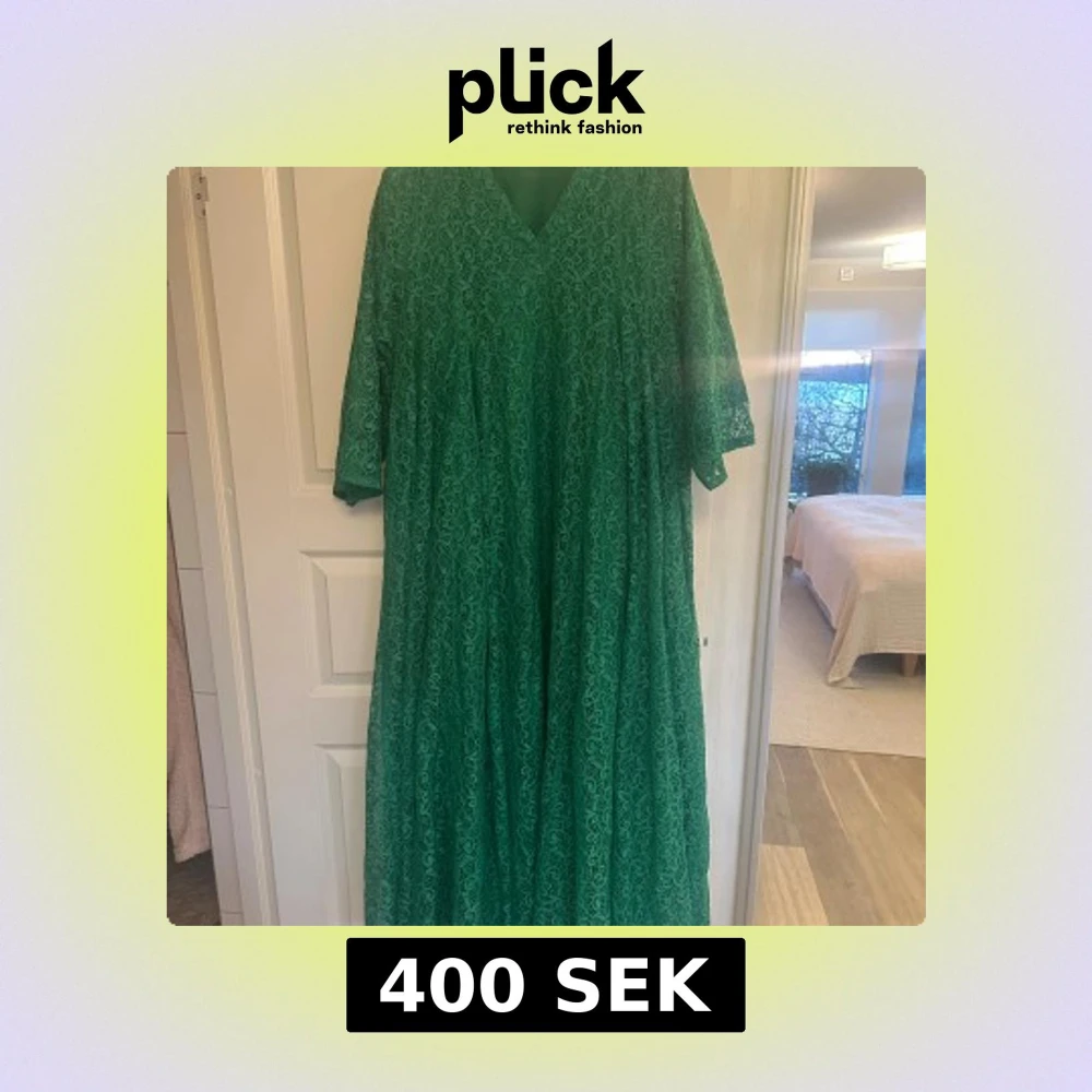 Säljer en grön långklänning med v-ringad hals och trekvartsärm. Klänningen är gjord i vacker spets med ett detaljerat mönster och har ett luftigt fall. Perfekt för dig som vill sticka ut med färg och elegans. Spetsen ger en lyxig känsla och klänningen har en loose passform.