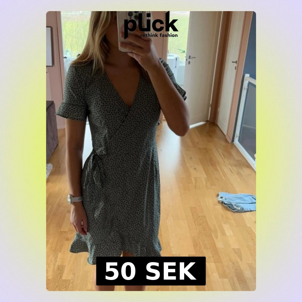 Söt ljusgrön omlottklänning med små svartblommigt mönster, kort ärm och volangkant nertill. Klänningen har v-ringning och knyt i midjan för en snygg passform. Perfekt för vår och sommar!