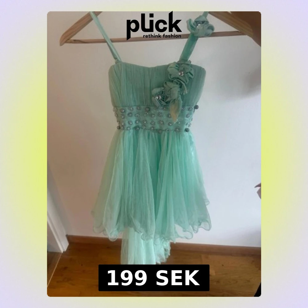 Säljer en mintgrön klänning med tunna axelband, dekorerad med pärlor och blommor på överdelen. Klänningen har ett luftigt, transparent tyg och asymmetrisk kjol som ger ett drömmigt intryck. Perfekt för dig som vill sticka ut med en unik look. Passar 6/7 år.