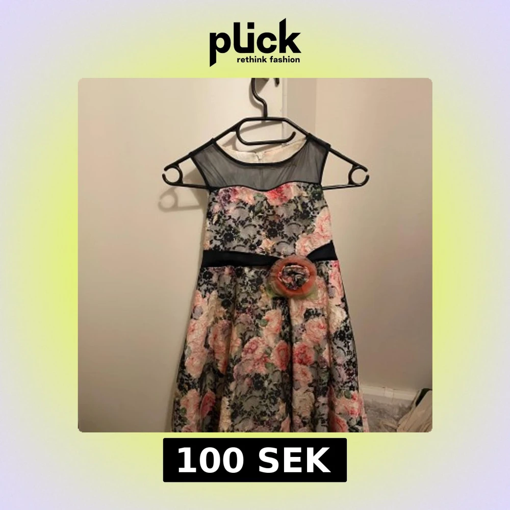 Charmig blommig klänning från Miss Seviva med ett svart meshok och ett dekorativt bälte med blomdetalj i midjan. Klänningen har en vacker blommönster i rosa och gröna toner och en dragkedja i ryggen.