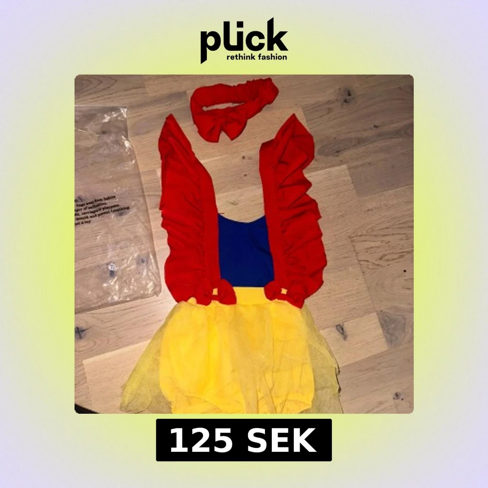 Söt Snövit-inspirerad babyklänning med matchande hårband. Klänningen har en blå överdel, röda puffärmar och en gul kjol med tyll. Perfekt för kalas eller maskerad! Supersöt babyklänning inspirerad av Snövit med blå överdel, röda volangärmar och rosetter samt gul tyllkjol. Matchande röd hårband med rosett ingår. Perfekt för temadagar eller maskerad! 🎁