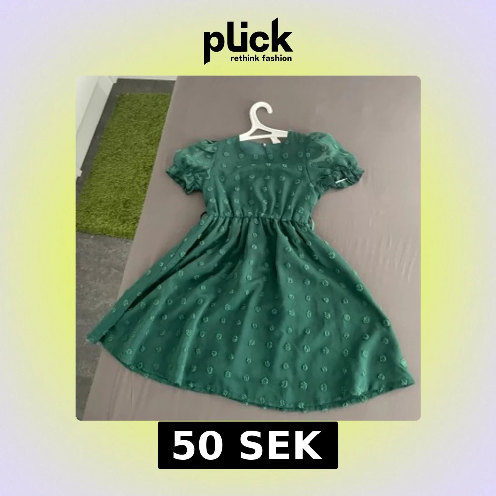 Säljer en söt grön klänning med puffiga kortärmar och rund hals. Klänningen har ett diskret blommigt mönster och markerad midja som ger en fin siluett. Perfekt för dig som gillar romantisk och lekfull stil.