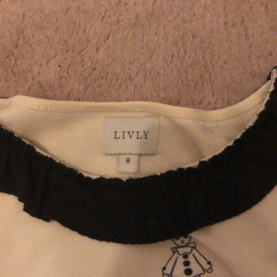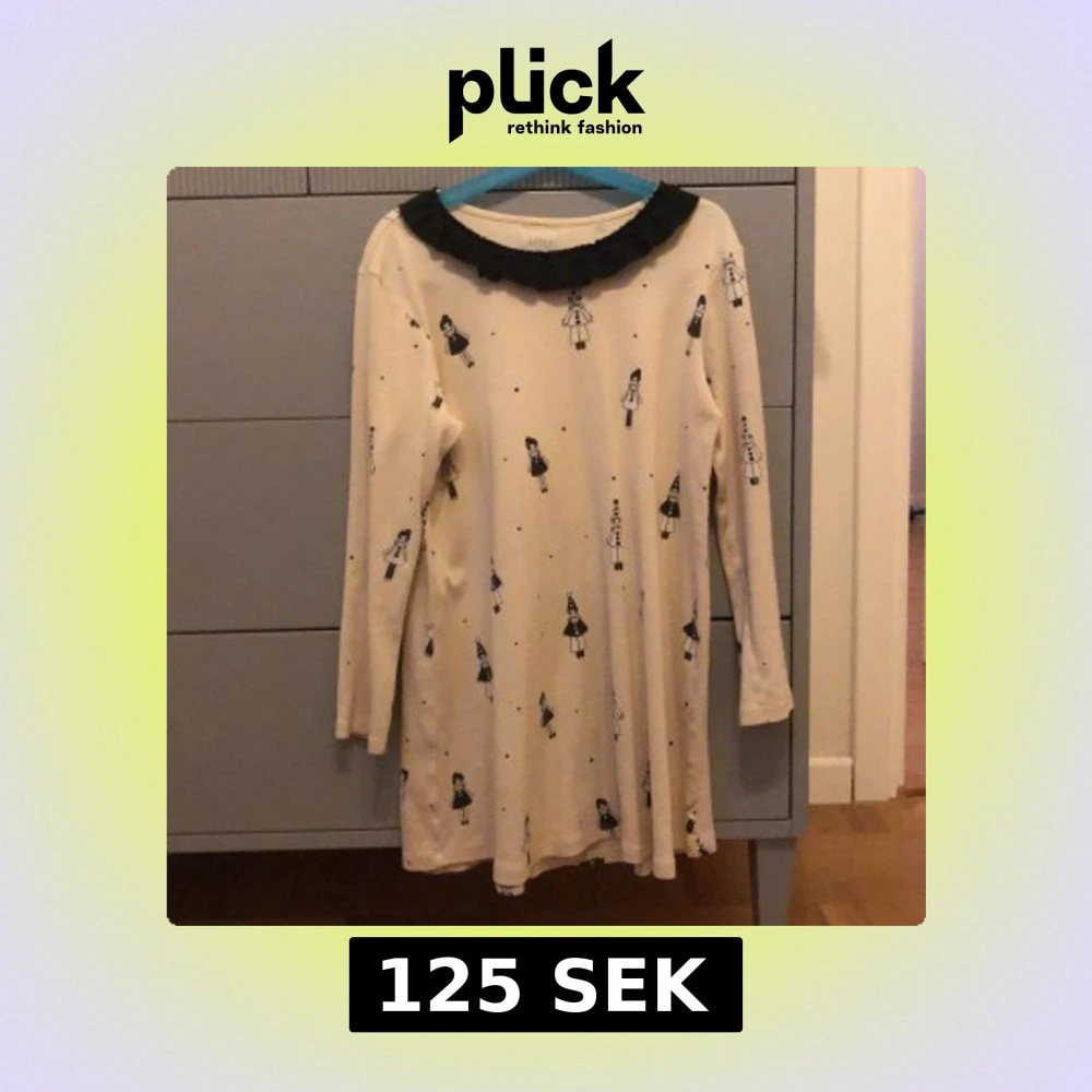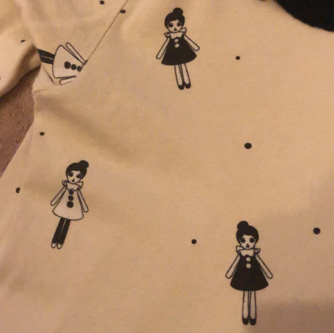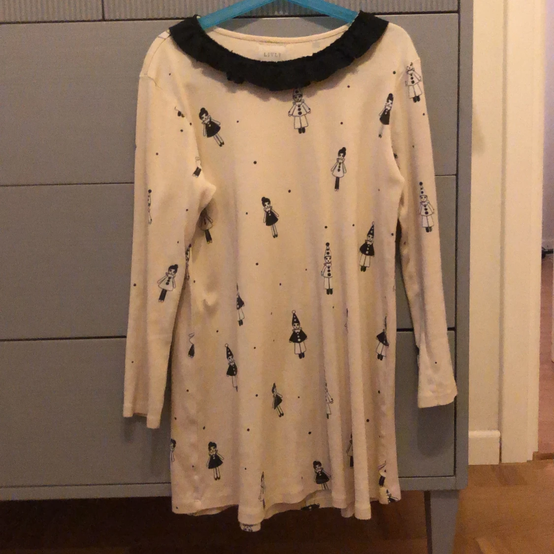 Supersöt vit klänning från LIVLY med svart volangkrage och lång ärm. Klänningen har ett gulligt svart mönster med små tecknade figurer över hela tyget. Perfekt för dig som gillar lekfull stil!