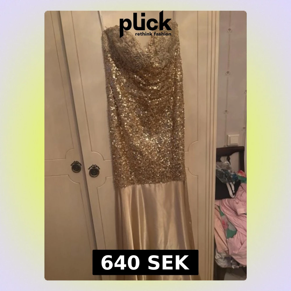 Säljer en elegant långklänning från Jovani i guld med paljetter upptill och slät satin nedtill. Klänningen har axelbandslös design och en vacker draperad överdel som ger en lyxig känsla. Perfekt för dig som vill sticka ut på bal eller fest.