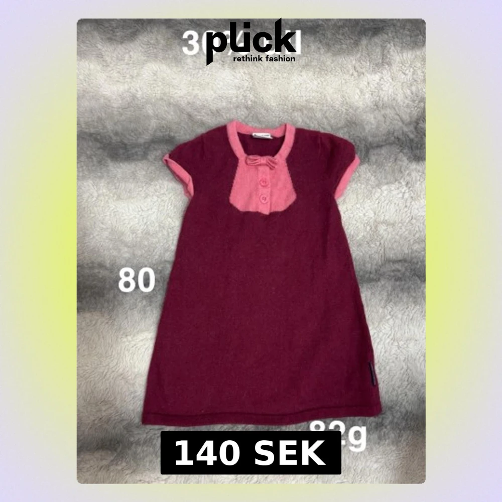 Supersöt vinröd kortklänning med rosa detaljer, liten rosett och knappar framtill. Gjord i mjuk ullmix, perfekt för kyligare dagar. Kortärmad och enkel att matcha med strumpbyxor eller leggings.🌸 Fint använt skick. 30% ull. Storlek 80