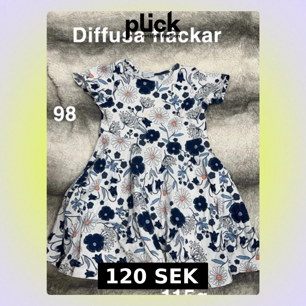 Supersöt vit klänning med blått och rosa blommönster. Klänningen har korta ärmar och en mjuk, snurrig kjol. Perfekt för varma dagar och lek utomhus. 🌸 Diffusa fläckar. Storlek 98