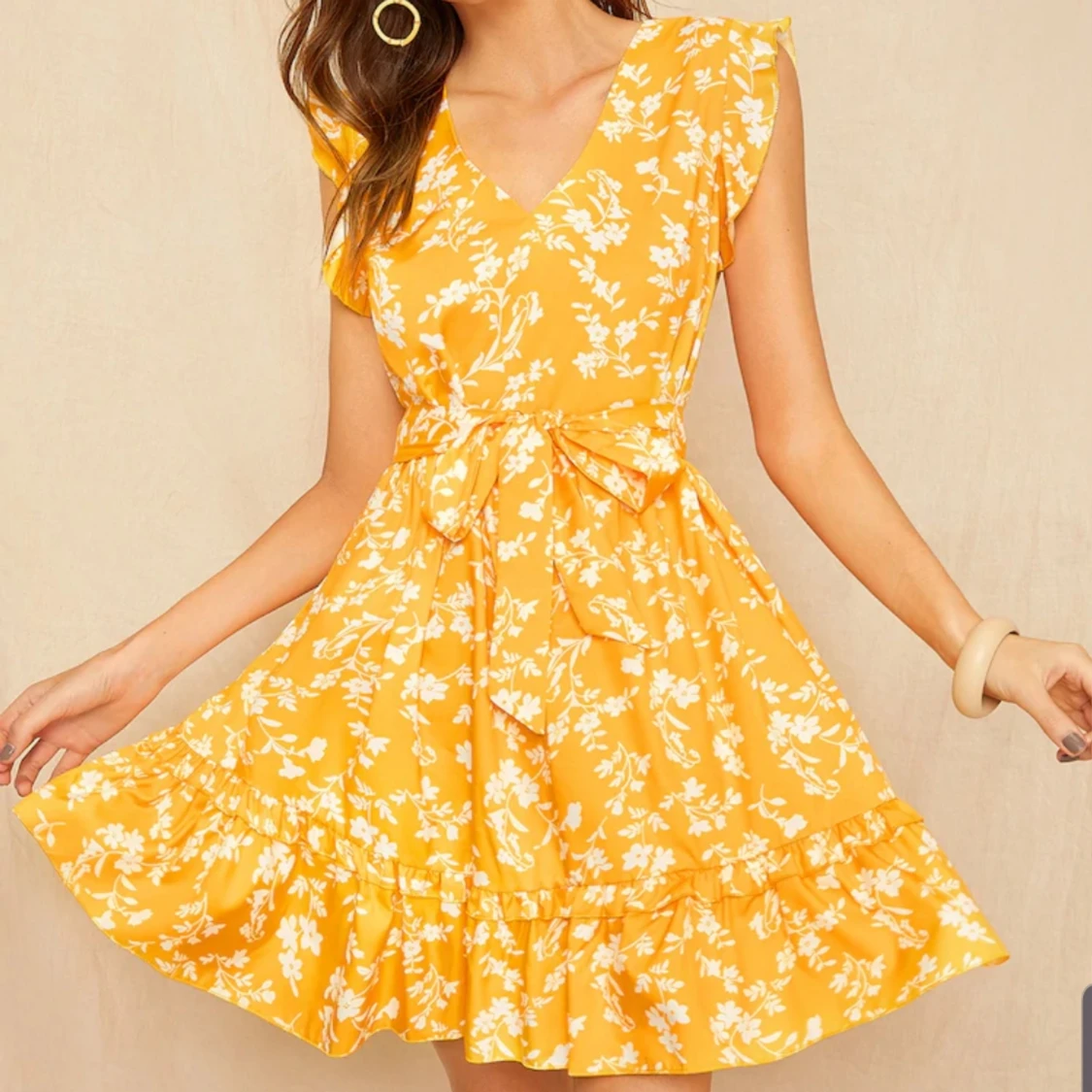 Gul oanvänd blommig klänning med små volanger och knytband i midjan, storlek 36. Frakt tillkommer. Från djur och rökfritt hem 🌸
