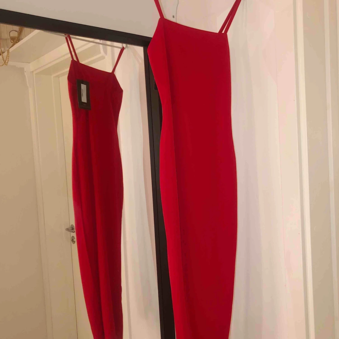 Röd tight klänning med tunna band, sitter väldigt fint och slutar under knäna