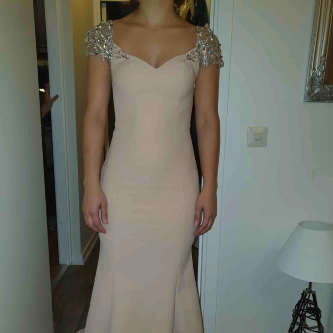 Klänning med detaljer vid armarna. Ryggen har extra tyg som är syd som kan tas bort vid köp.