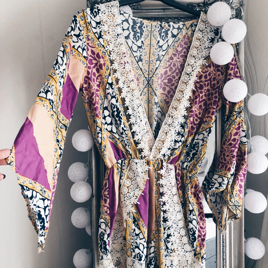 En fin playsuit med mönster av olika färger. Jag som har en liten byst har fått sätta en säkerhetsnål då den är väldigt V-ringad. Köpt från en utländsk sida så har inget specifikt märke.🌸