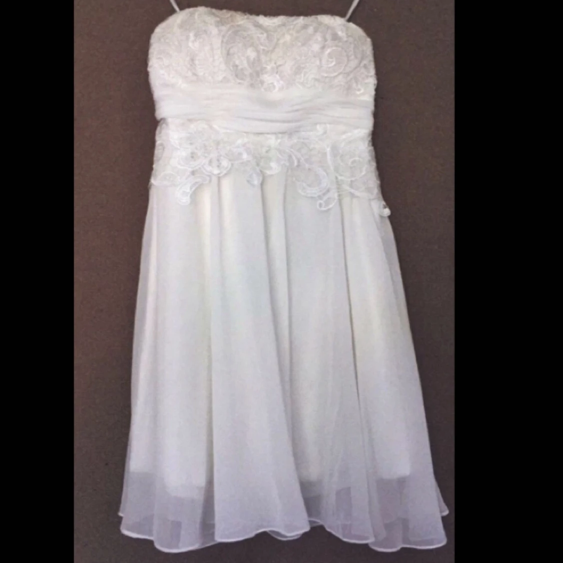 En vit spetsklänning men snygg snörning i ryggen, den är axelbandslös , den är endast använd på en skolavslutning. Nypris 1200kr Vid snabb affär så kan priset diskuteras